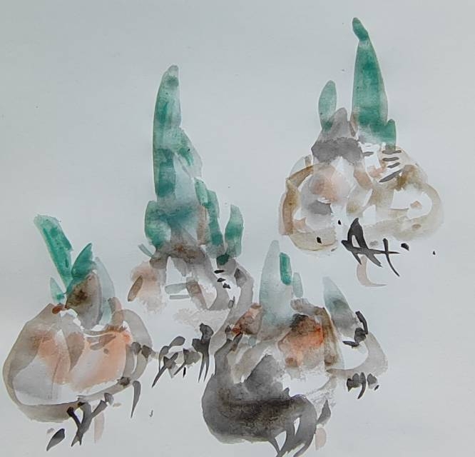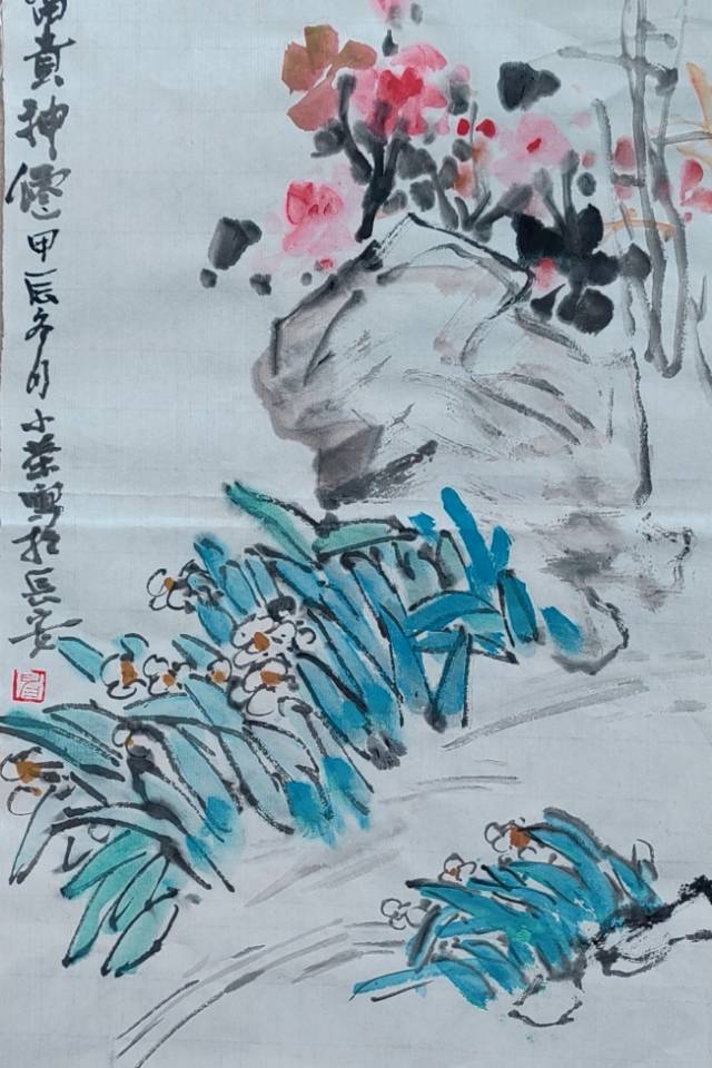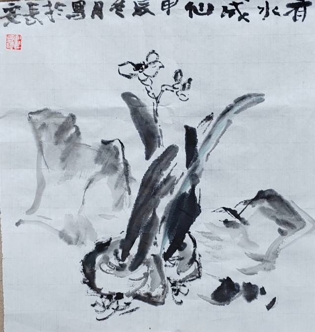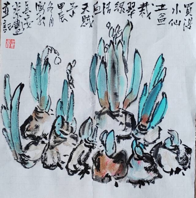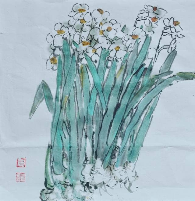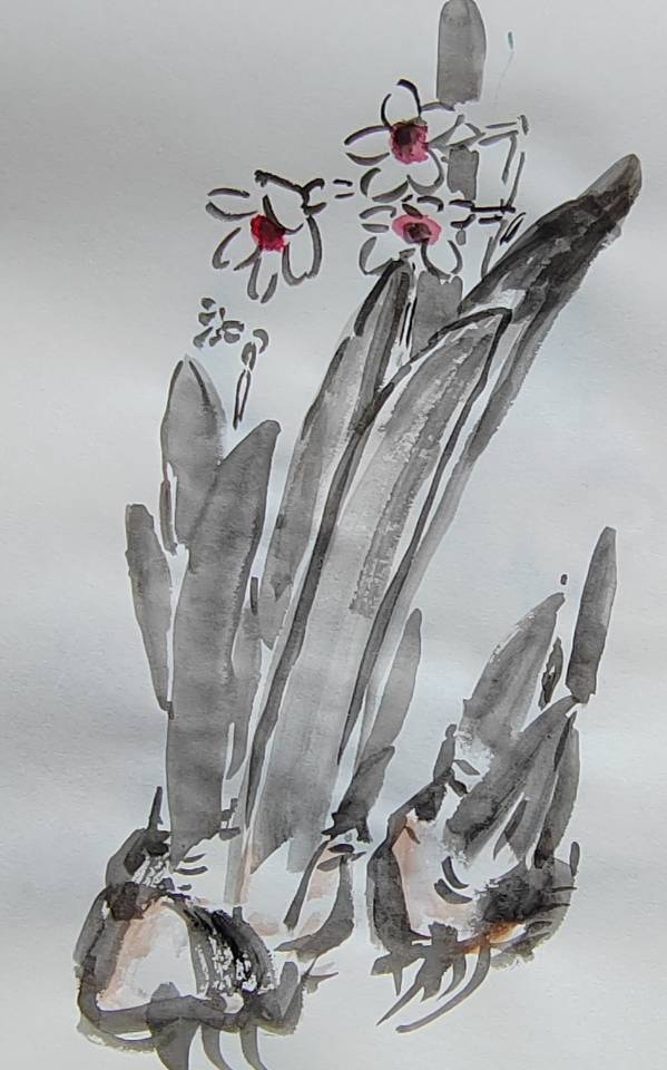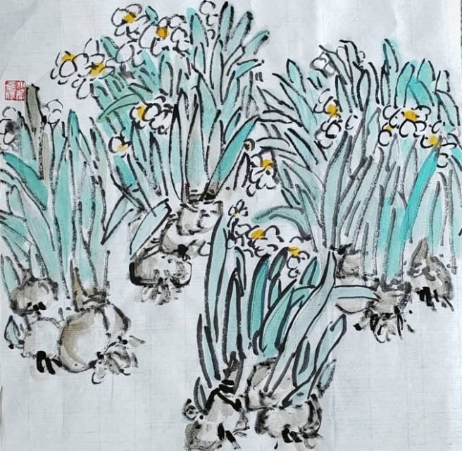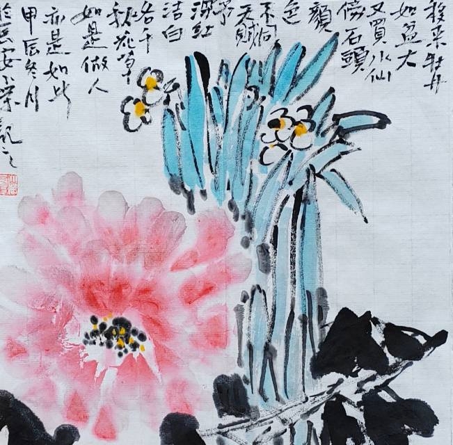 余二十始写花,今六十有八,每當秋春百卉蕾放之时,見水仙,观之写之都轻描淡写。今观花细描一葉一花一茎,心有所得,笔下花之,舒、侧、偃仰,纷靡自如。