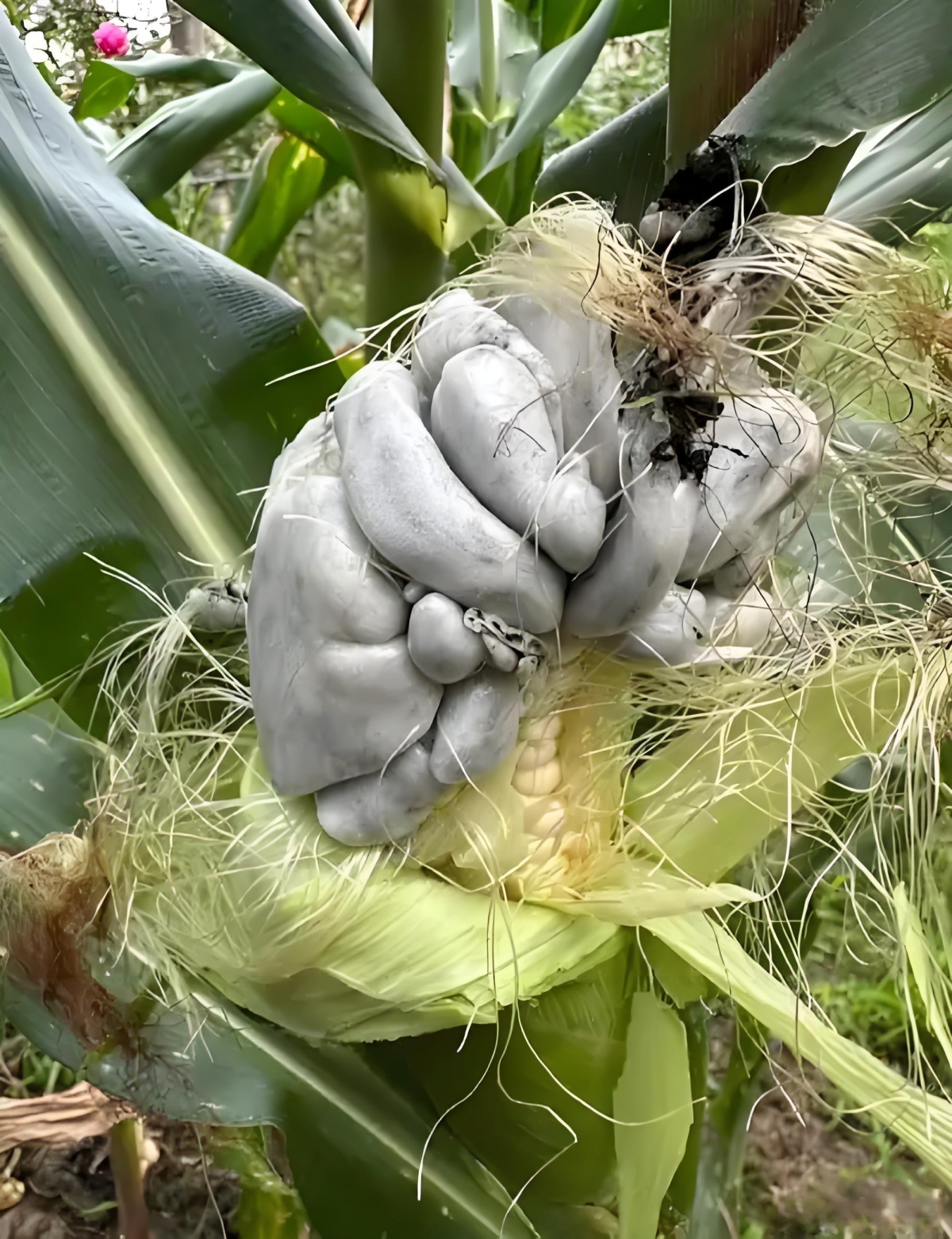 (8)采摘苞谷菌子。苞谷菌子学名黑粉菌,是寄生真菌总称,寄生在寄主植物上,呈黑色孢子堆,对苞谷危害甚大。由于过去植物防疫手段少,苞谷结果实的位置常有变异物——苞谷菌子。此物基本在农历六月苞谷抽天花后开始生长,约半大孩子和小孩拳头大小,起初为白色,后放孢为黑色。苞谷菌子是美味,吃起来面面的,口感很好。为了寻求美味,家庭妇女和半大孩子冒热浪钻苞谷地寻找苞谷菌子,回家后要么鲜炒下饭,要么把它切 片晒干,待蔬菜少时食用。晒干的苞谷菌子吃起来纨筋筋的,很有嚼头,是喝酒下饭的上品。随着农业科技的发展,苞谷菌子少了。